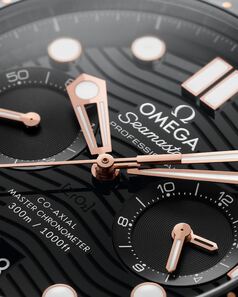 Este cronógrafo de 44 mm está realizado en acero noble y oro Sedna™ de 18 qt e incluye un bisel cerámico negro pulido, con escala de inmersión Ceragold™. Los pulsadores son también de cerámica negra pulida, igual que la esfera, que luce unas ondas grabadas por láser y una ventana de fecha situada a las 6.